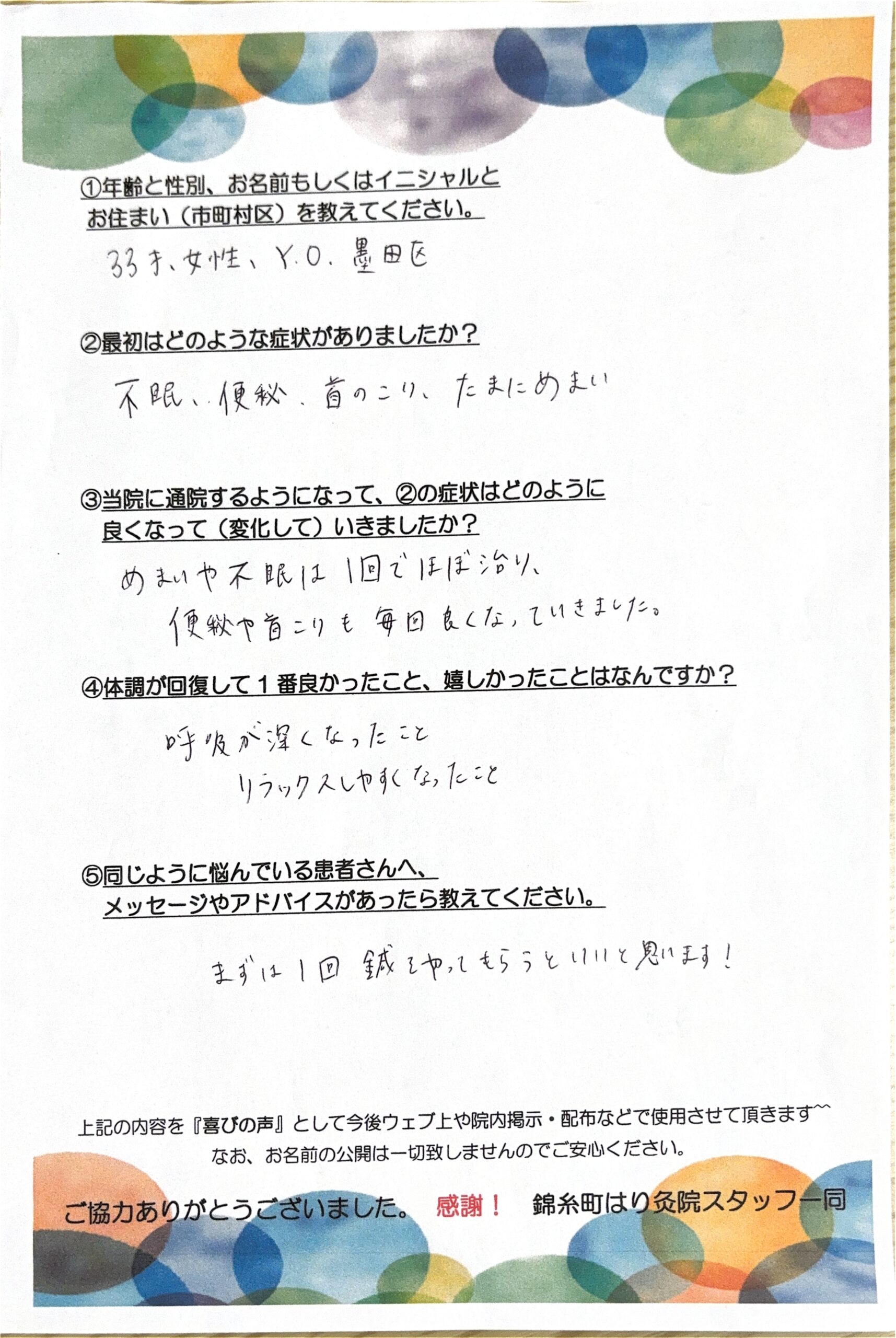 めまいや不眠は1回でほぼ治り、便秋や首こりも毎回良くなっていきました。