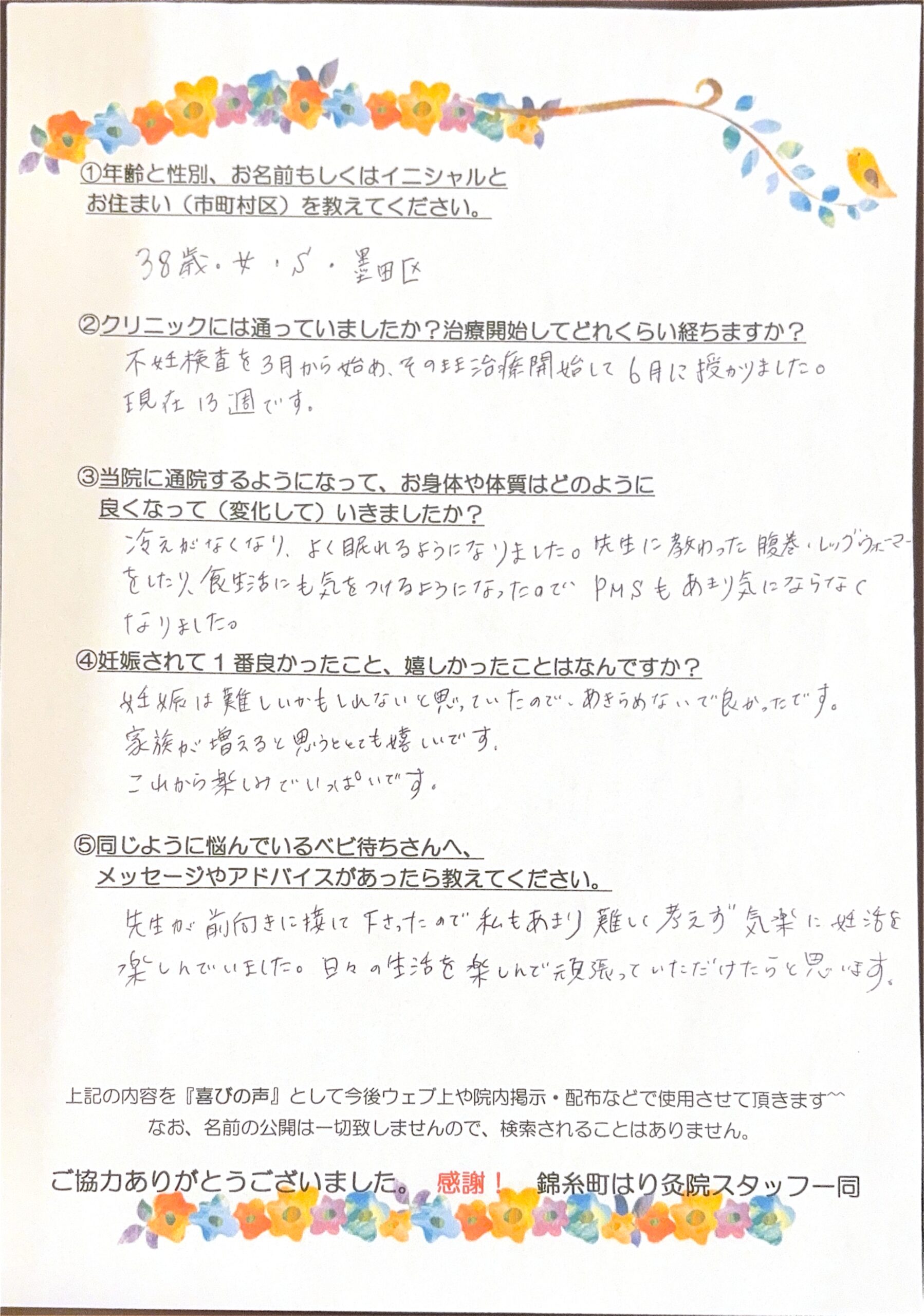 先生が前向きに接して下さったので私もあまり難しく考えず気楽に妊活を楽しんでいました。日々の生活を楽しんで頑張っていただけたらと思います。