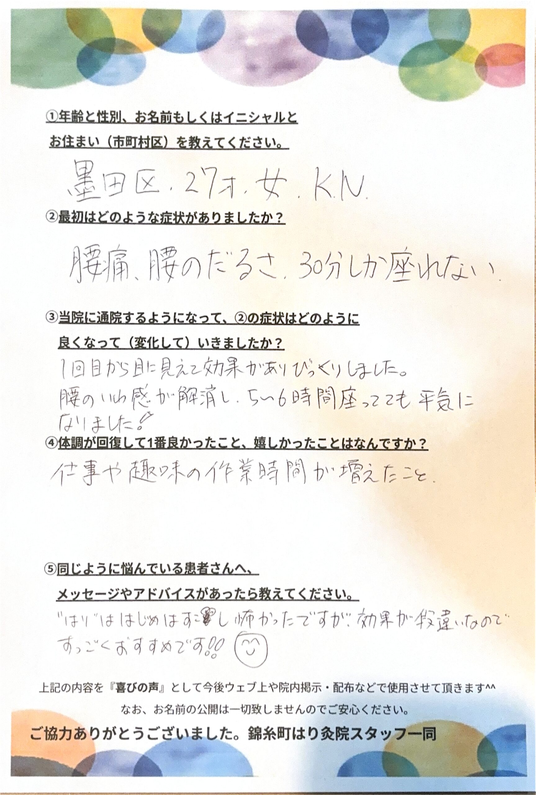 腰の違和感が解消し、5~6時間座っていても平気になりました。