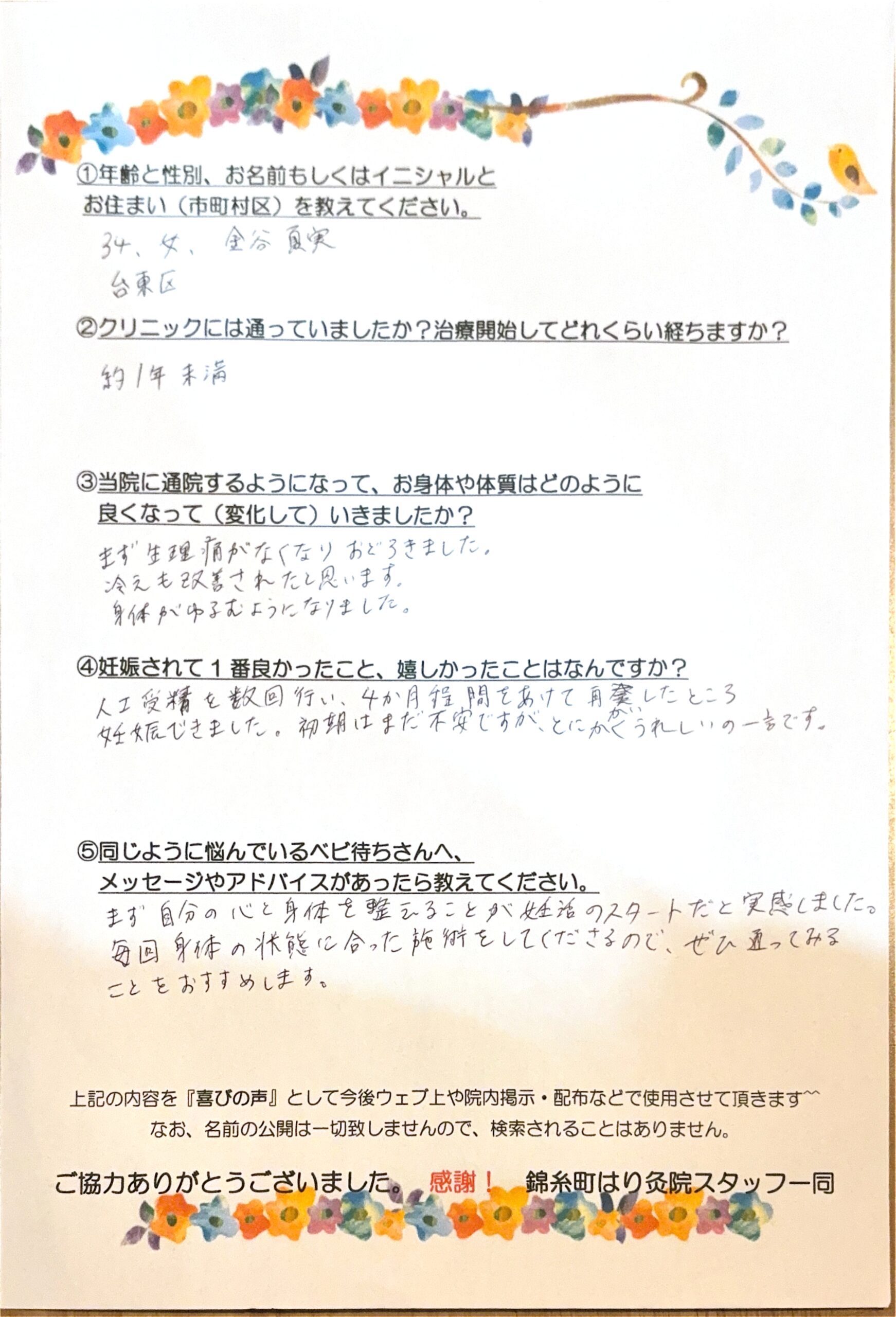 この度は妊娠おめでとうございます。不妊治療、本当によく頑張りましたね。私達にとってもKさんの妊娠がとても嬉しいです。私達も不妊専門院として鍼灸・整体術を通して患者さんの妊娠に導くようにサポートしております。まずはお身体の状態把握から始めて、妊娠に向けて改善ポイントなる課題を出してその解決をしていく事を大切にしています。Kさんから頂けたお言葉通り