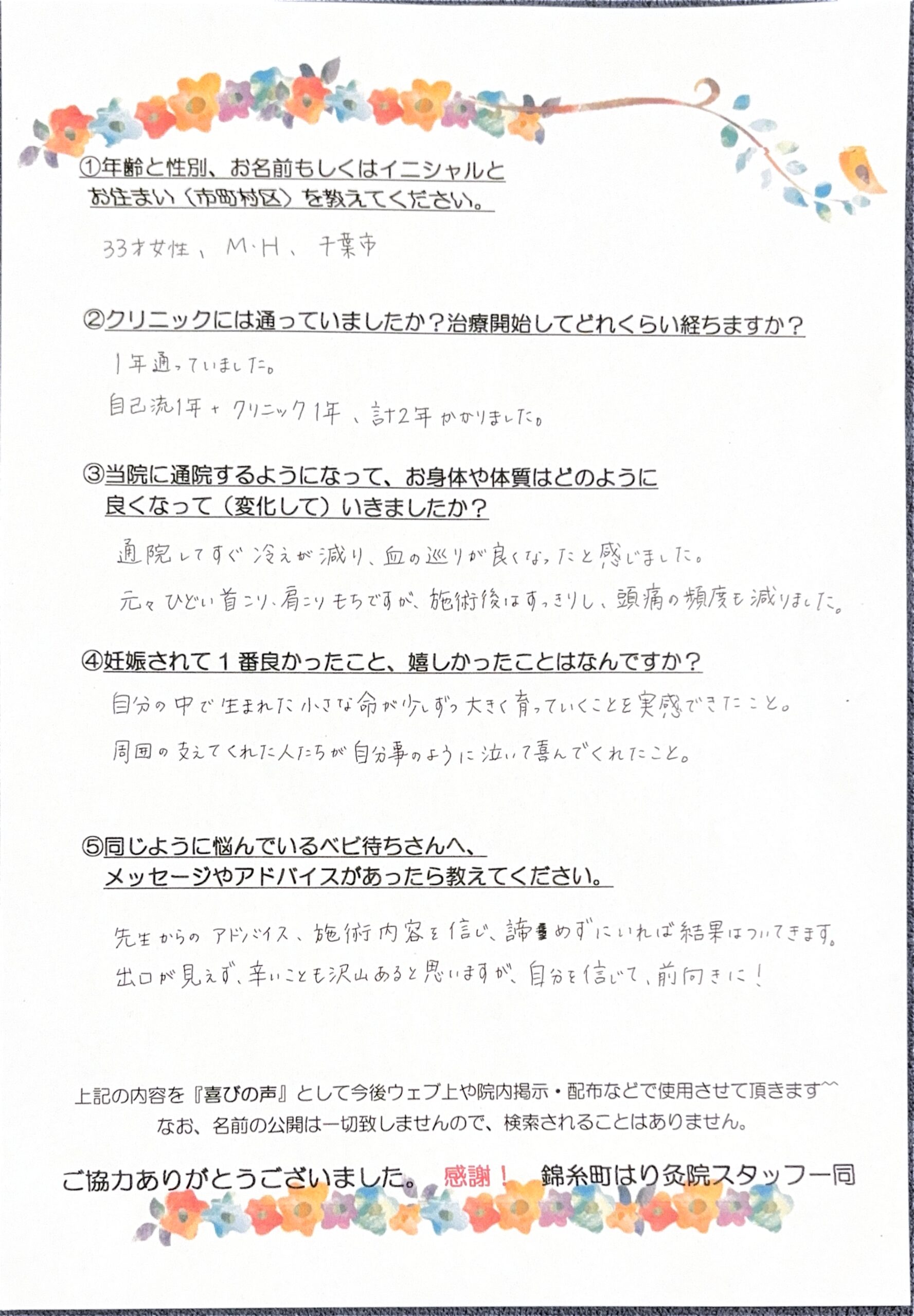 本日は、当院に通院され、見事待望の赤ちゃんを授かった33歳・千葉市在住のM.H様からいただいた貴重なアンケートをご紹介します。